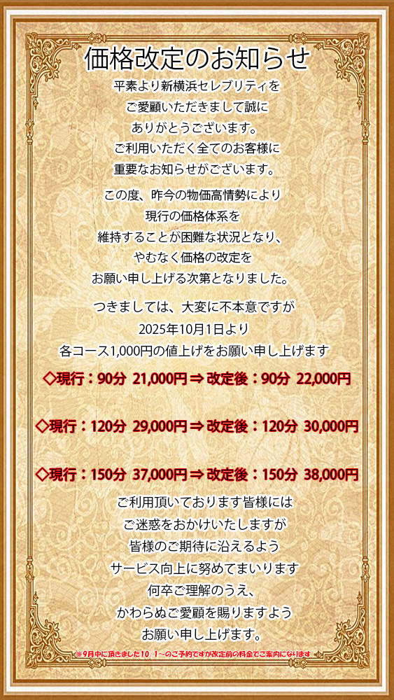 待ち合わせ型高級デリバリーヘルス「新横浜人妻セレブリティ」は、容姿端麗な大人の女性のみを厳選。魅惑的で濃厚な時の流れを演出いたします。綺麗なお姉さま、艶っぽい人妻の想像を超えた快楽と癒しの世界をお楽しみください。